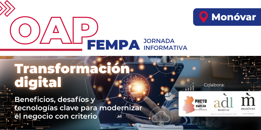 Apúntate Monóvar abordará la transformación digital aplicada al emprendimiento en una nueva jornada Acelera La digitalización será la protagonista de la próxima jornada del ciclo Acelera en Monóvar. El 25 de mayo de 2026, la Oficina Acelera Pyme FEMPA desarrollará el taller “Transformación Digital para emprendedores”, en colaboración con el Ayuntamiento de Monóvar, su Agencia…